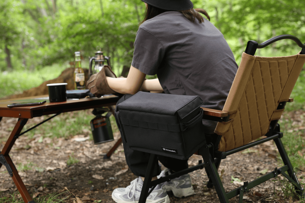 同時に発売した「シェフチェア」に取り付けることのできるミニクーラーです。 ドリンクはもちろんちょっとした小物入れなどにも使用することができ、いろいろなものを手元に置くまったりキャンプの名脇役!