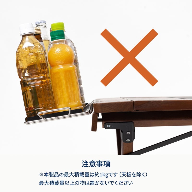※本製品の最大積載量は約1kgです。 ※最大積載量以上に中に物を入れた状態でテーブルに装着した場合、テーブル本体のパーツが浮き、安定性に欠ける恐れがございます。 ※製造工程上、ステンレス部分に微細な傷が生じたり、溶接部の仕上がりに若干の差が生じる場合がございます。製品の特性上避けられないものであり、ご使用上の問題はありません。 |