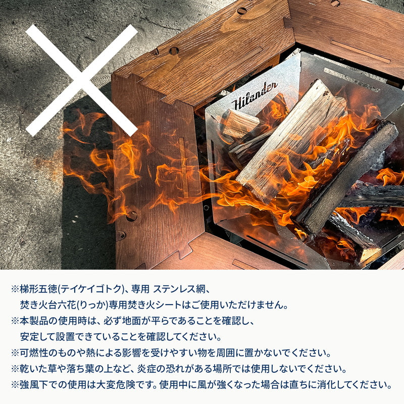●※梯形五徳(テイケイゴトク)、専用 ステンレス網、焚き火台六花(りっか)専用焚き火シートはご使用いただけません。