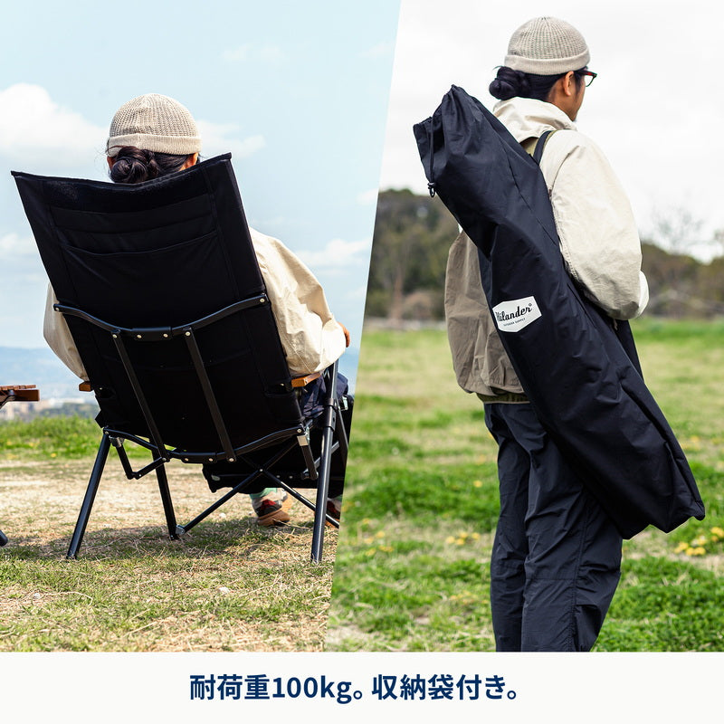| 素材 | アルミ(フレーム)、スチール(フレーム)、ブナ(肘掛け)ポリエステル600D(本体生地、収納袋) |