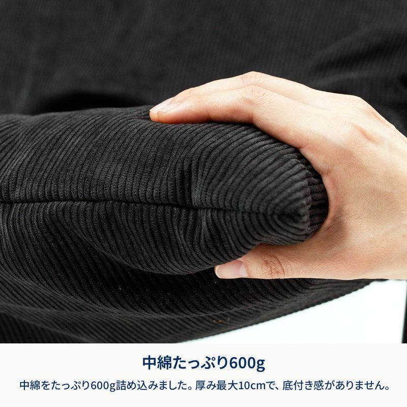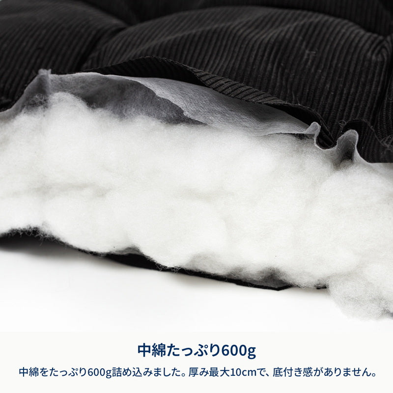 中綿をたっぷり600g詰め込みました。厚み最大10cmで、底付き感がありません。