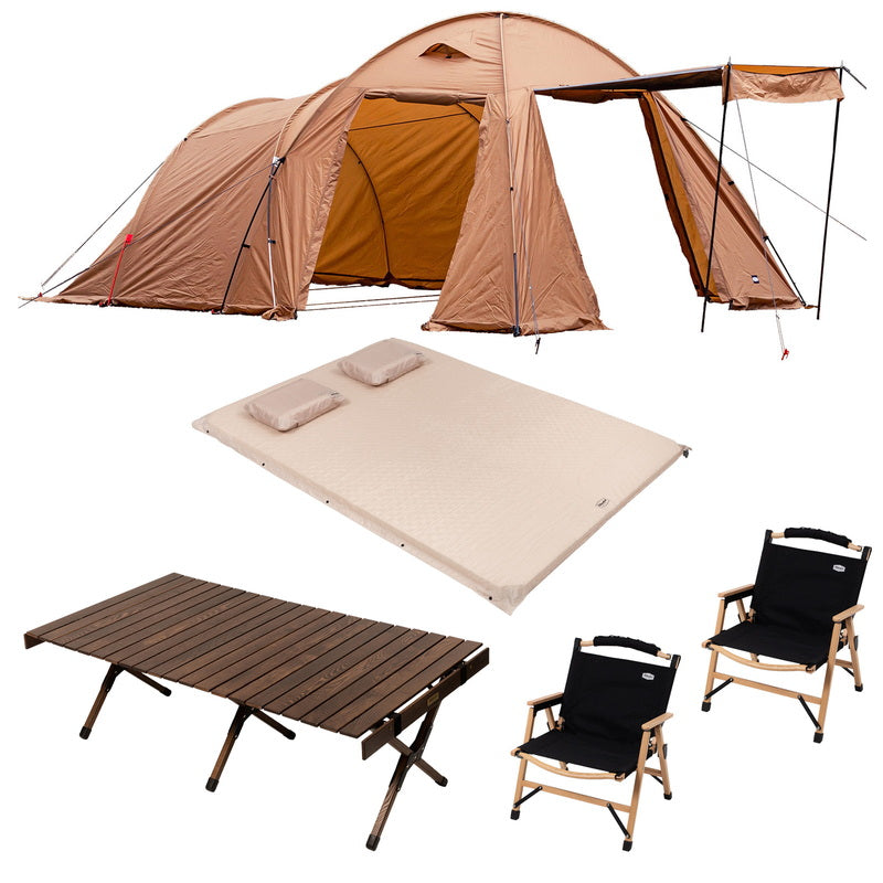 ●テント、ダブルサイズマット、ウッド素材のテーブルとチェア2脚の5点セット。
