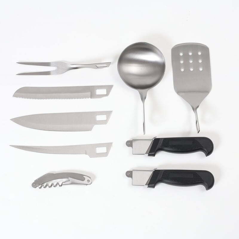 ●材質:ステンレス(包丁/魚包丁/パン切り包丁/おたま/フライ返し/フォーク/コルク抜き)、ハンドル(プラスチック)、ポリエステル(収納袋)